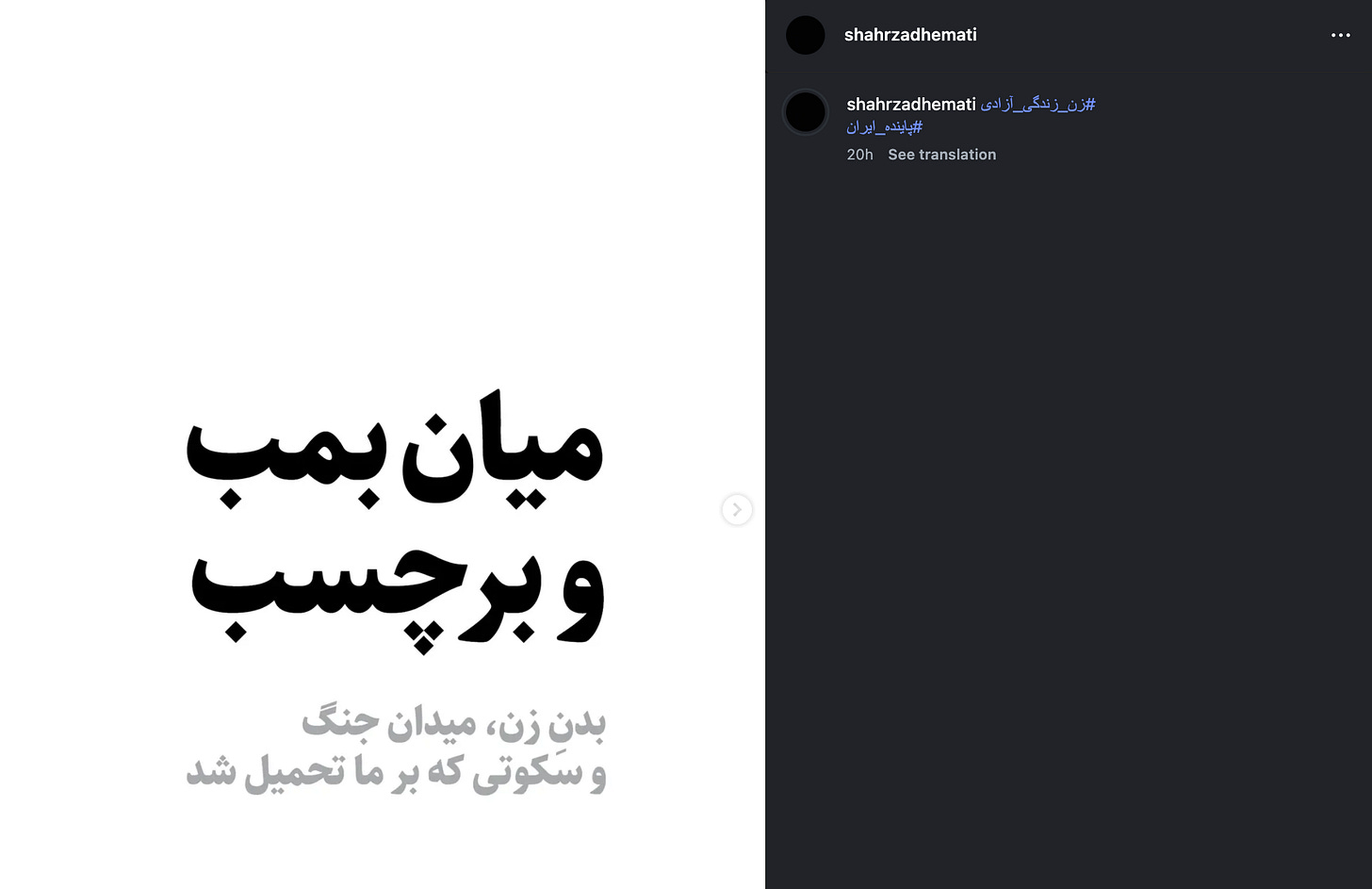 But as singular as this conversation was, it was critiqued, quite rightly, for not just the absence of women’s voices (as people have pointed out, Azad has rarely featured women in its panels) but also the absence of women in “the political imagination” of these three men. As the writer Mahzad Elyassi noted in her Instagram post: “In the past 3 years, women, by refusing mandatory veiling in Iran, have created a different type of politics. A politics based not on taking over the pillars of power but on the everyday erosion of it…yet this political agency is either marginalized or remains invisible in the analyses of many men.”2 Hemati’s piece reminds us of both the singular place that the Women, Life, Freedom occupies in Iran’s modern history and the fact that the effects of war, much like so many other things, are determined by both class and gender. She also, sadly, points out that the opposition led by Pahlavi outside of Iran has not only rejected the Women, Life, Freedom movement, in the name of a secular Iran it is actively disparaging it.