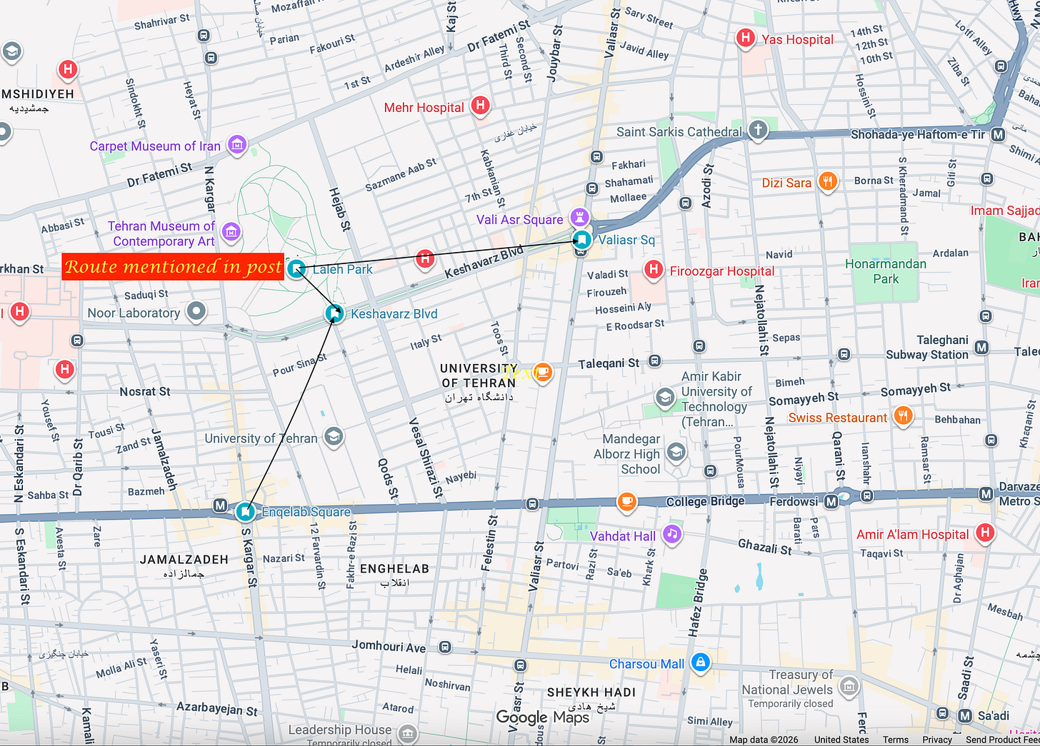 A few bookstores are open around Meydan-e Enqelab [in English commonly known as Enqelab Square though it’s a roundabout.] But even here, there is a sharp smell of sulfur. Someone gestures with his hand, pointing at a location he says they have bombarded in the south. A black plume of smoke rises to the sky seemingly from Shahr-e Rey.