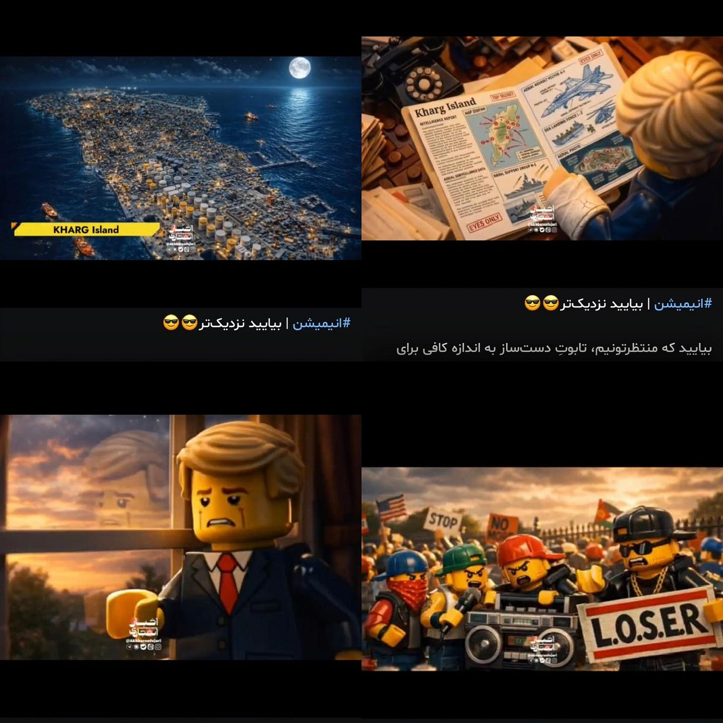 In the animation, characters appear as Lego figures. Donald Trump is depicted as exhausted with a bandaged hand, uncertain of his next move in the Persian Gulf. Kharg Island is reimagined as a futuristic hub resembling a new UAE, complete with advanced infrastructure, modern oil facilities, and urban development. The animation portrays Iranian forces launching attacks from Kharg toward U.S.-aligned positions in Saudi Arabia and Kuwait. Missiles carry symbolic coffins labeled “For Loser.” The video concludes with a distant view of Kharg Island beneath the Iranian flag, accompanied by the phrase: “Come Closer.” [You can watch the video here.]