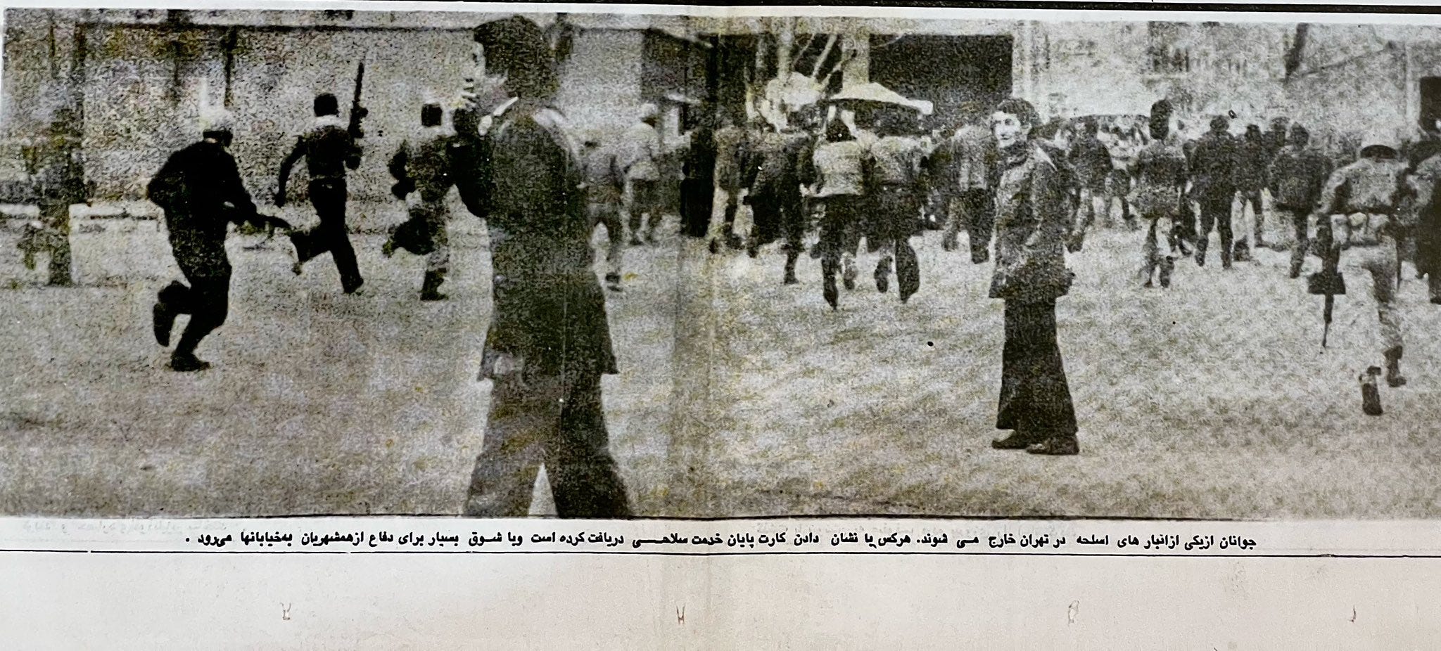 From 19th of Bahman [Feb 8] we were busy disarming the barracks and arming our own people. As a result, on the day of the revolution, I was in one of the barracks. We would take as many guns as we could and hide them in homes. We had a ramshackle house in Rahahan square [in south Tehran] where we would hold our workers meetings there. To take the guns there…those days no cabs were running but it was a normal thing to see people walking around with weapons. In the barracks themselves, the soldiers would encourage us and the officers would shout “long live the people” so that they wouldn’t get beaten up. In those days you would never see an officer in their uniform on the streets.