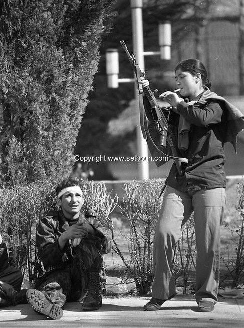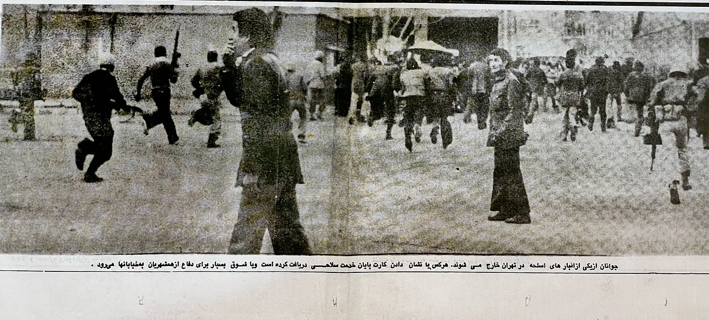 Photo caption: Youth leaving one of Tehran’s arsenals. Anyone who shows they have done their military service gets a weapon and enthusiastically goes into the streets to defend their compatriots.
