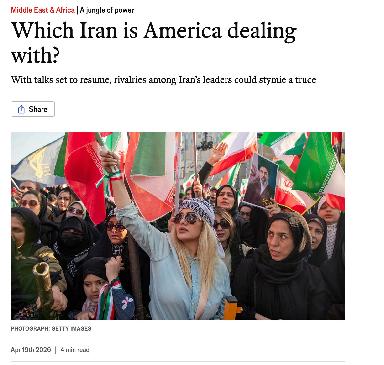 The third headline in The Economist’s “A Jungle of Power” jumble is “Which Iran Is America Dealing With?” This notion that a “healthy” Iranian political system is one with a united front is a fiction created by outside pundits in order to keep their plug-and-play analyses going. It’s an ironic fiction, since disagreements over the direction of policy are valorized in other places, such as in the US and in Israel. You don’t send over 70 people to negotiate in Islamabad if you think people with various stakes and opinions are a sign of weakness. (Though I will admit, I was a bit taken aback when I learned the US negotiating team was 300 people. I got asked by journalists multiple times how I understand why 70 people were sent to Islamabad by Iran. Not even once was I asked about the 300-member US team, but I digress.)